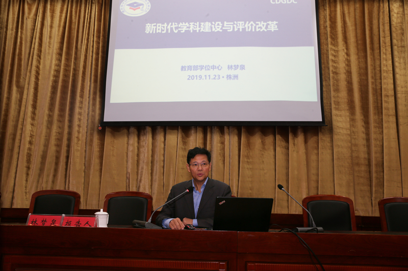 会上,林梦泉以《新时代学科建设与评价研究》为题,从新时代学科建设与评价面临挑战、改进不科学学科评价方法思考、学科评价的经验与改革、2019年专业学位水平评估等四个方面详细全面地阐述了学科建设和评价改革的整体思路,回答了建设改革过程中的关键问题。他指出,学科评价改革工作的开展,要以人才培养质量为核心,聚焦立德树人、培养质量与行业需求,认真做好人才培养质量评价、坚决破除“五唯”顽疾、强调师德师风传承、突出社会服务贡献等工作。
