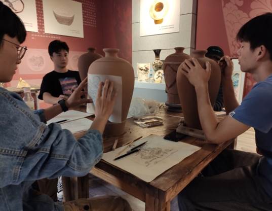 作品展筹备前期,陶瓷设计与工艺专业2018级学子们分赴北方磁州窑和南方景德镇窑,开始了为期两周的“民族艺术研究与考察”之陶艺研学之旅。此次考察围绕专业定位和陶瓷产区对创新设计人才的需求,将文化传承与实践创新相结合,从静态文物观摩到动态的非遗技艺展示再到亲自创作体验。在陶瓷古窑址结晶千年的窑汗上,在民间作坊与大师工作室充满阳光与自信的非遗传承人笑脸上,在机械化加工车间的流水线上,短短十天,如历千年。心灵在泥与火的交融中得到净化,灵感在目光与泥坯的触碰中自由迸发,或釉彩飞舞,或刀泥四溅,或凝神静气,原本素色的花瓶、瓷盘、瓷板等,在陶艺学子们的手中幻化为一件件五彩斑斓、风格独特的作品。考察结束后,同学们在老师的带领下通过全过程参与布展学会了分工协作、主动思考,掌握了设备使用、展示设计等技能,培养了大局意识和团队精神,在收获创作成果的同时,也收获了满满的自信和幸福。