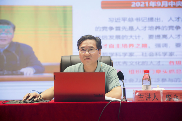 湘潭大学党委副书记廖永安作了题为“新时代高校干部成长的几点思考”的讲座。他从习近平总书记的“干部观”入手,结合党和国家对高等教育的要求,从习近平总书记对干部成长的要求与期许、地方高校发展离不开干部的成长与担当、新时代高校干部成长的思考与体会等三个方面,对检验干部担当作为的根本标准、有助于高效运用资源的工作方法、让干部积极担当作为的内在动力、推动干部勇担当善作为的激励机制、干部成长与担当的实践路径进行了系统阐述和深入解读。