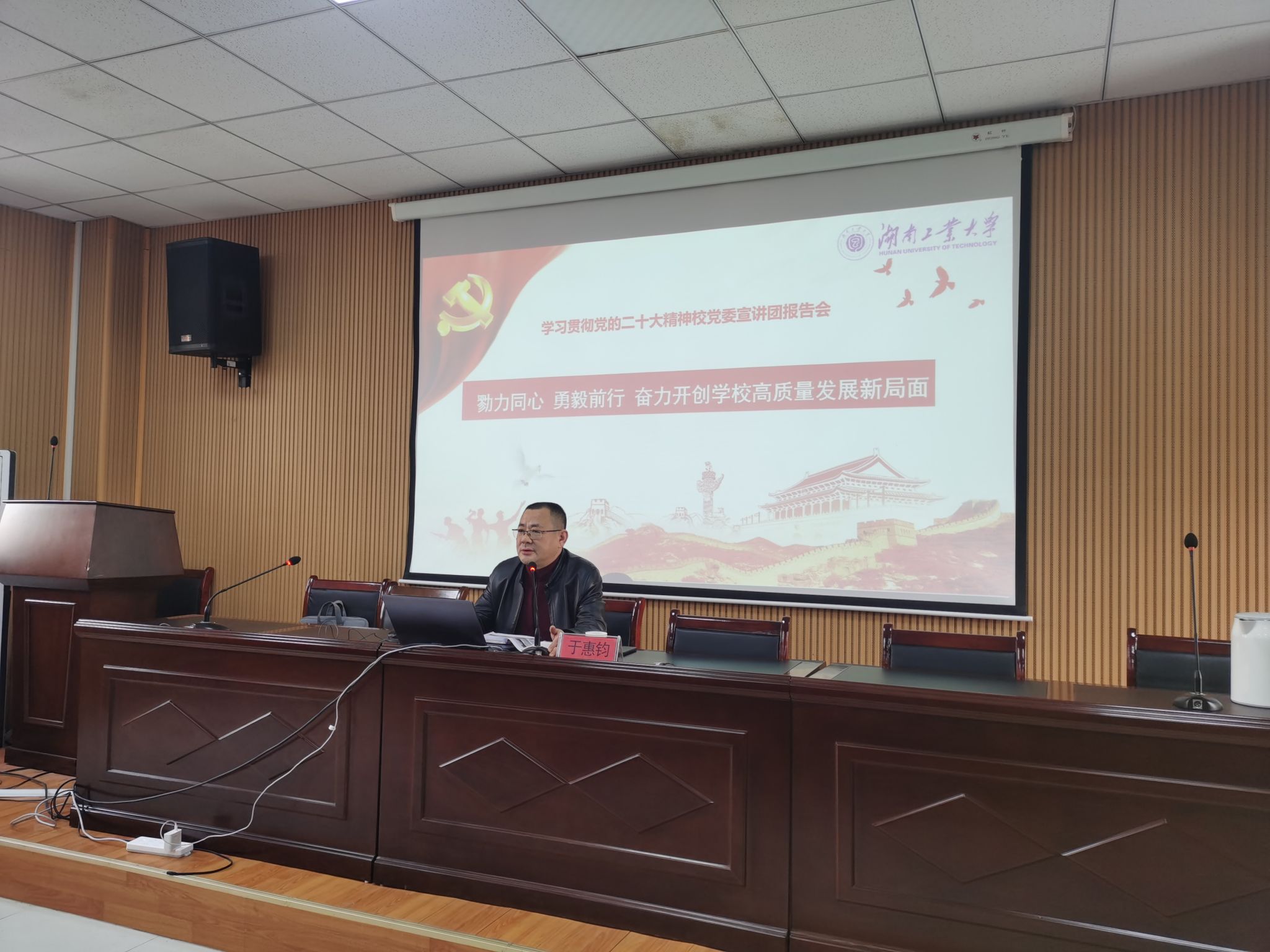 于惠钧以学习贯彻习近平新时代中国特色社会主义思想和党的二十大精神为主题主线,从“党的二十大的主题及主要成果”“过去五年的工作和新时代十年的伟大变革”“开辟马克思主义中国化时代化新境界”“新时代新征程中国共产党的使命任务”“贯彻落实新时代新征程的战略部署”“深入推进新时代党的建设新的伟大工程”“用新的伟大奋斗创造新的伟业”“坚持问题导向,推动学校高质量发展”等八个方面,联系习近平总书记在湖南考察时的重要讲话精神,结合学校工作实际,对党的二十大精神进行了全面深入解读。他强调,要学深悟透,深刻领会精髓要义,贯彻落实好党的二十大精神,坚持为党育人、为国育才。