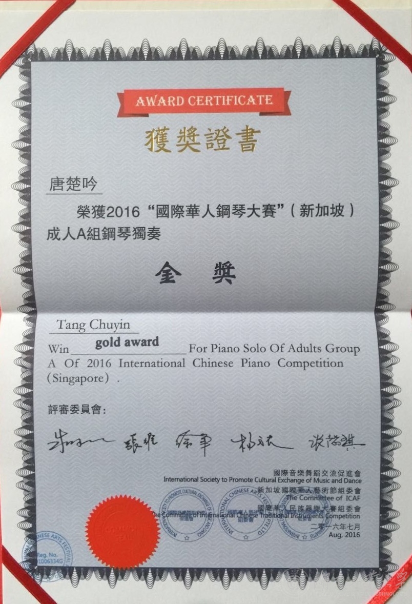 近日,德赢音乐学院教师唐楚吟在第八届新加坡“国际华人艺术节钢琴大赛”中,获得钢琴独奏组金奖。
