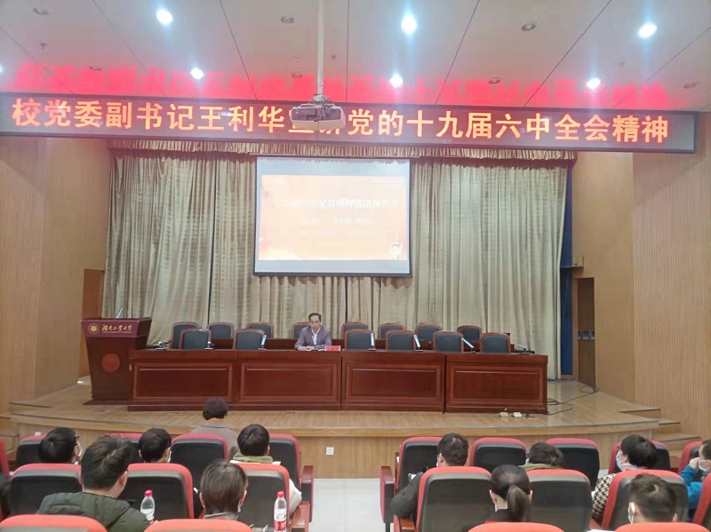12月21日下午,校党委副书记王利华在崇德楼报告厅为机关、直属单位、机械工程学院、材料与先进制造学院的所有科室相关负责人及党员教师代表宣讲党的十九届六中全会精神。