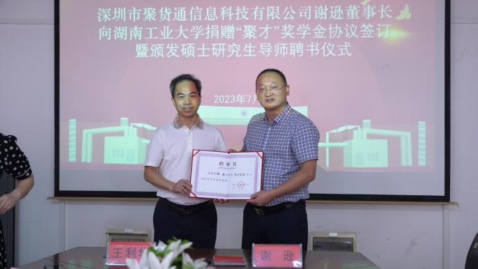 王利华为谢逊颁发了硕士研究生校外导师聘书。教育基金会与谢逊签订了“聚才”奖学金的捐赠协议书。本次奖学金金额为60万元,分6年捐赠,旨在奖励和资助学院品学兼优、具有创新精神的优秀学生和特别贫困学生。