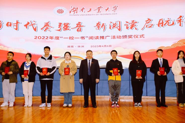 刘望结合“新时代奏强音,新阅读启航程”阅读推广活动主题,为全校师生重点推荐《觉醒年代》这本革命历史题材经典图书,倡议师生们细细品读,从字里行间感受一百年前中国的先进分子和一群热血青年演绎出的一段追求真理、燃烧理想的澎湃岁月。激励广大师生弘扬伟大建党精神,追求真理,燃烧理想,担当作为,爱党爱国爱人民,在新时代奋力绽放自己的青春光彩。仪式上,刘望书记为获得2022年度入馆率前5名的学院及获得2022年度湖南省一校一书“读书心得奖”的学生颁奖。