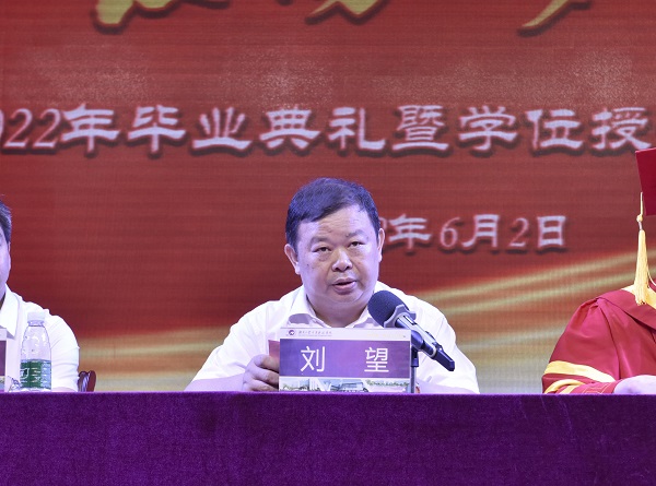 党委书记刘望代表学校对2022届毕业生顺利毕业表示祝贺。他希望同学们牢记习近平总书记寄语,做不负时代、不负韶华的追梦人。他对毕业生提出三点要求:一要志存高远,涵养家国情怀,始终忠于祖国、忠于人民,把爱家、爱国统一起来;二要练就本领,在实现中国梦的生动实践中放飞青春梦想,在为人民利益的不懈奋斗中书写人生华章;三要勇于实践,将满腔爱党和爱国热情转化为立足岗位、踔厉奋发的实际行动,攻坚克难、干事创业的实际成效。