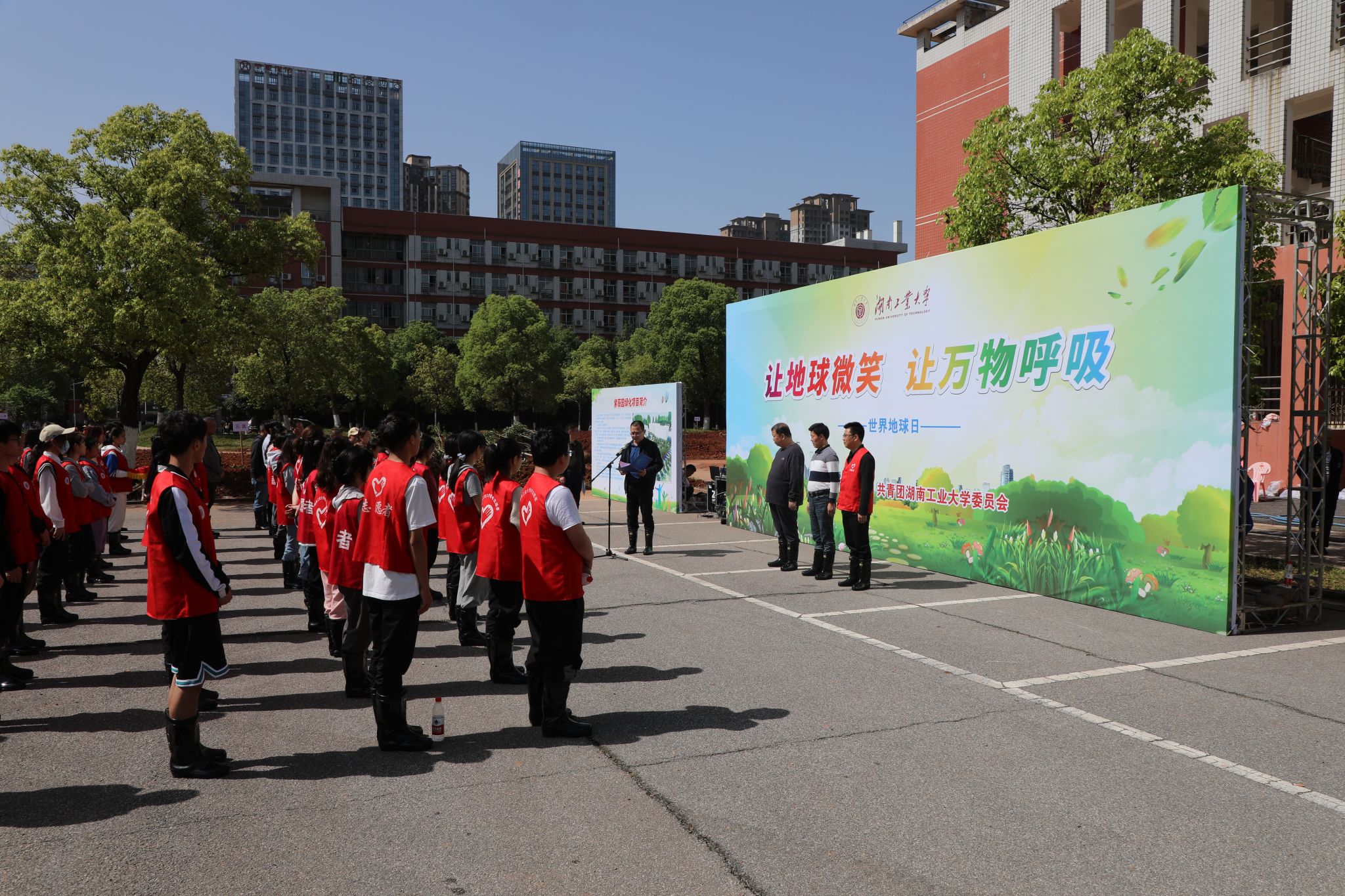 于惠钧致辞。他指出,人类只有一个地球,尊重地球就是尊重生命,拯救地球就是拯救未来。党的十八大以来,绿水青山就是金山银山的理念已成为全党全社会的共识和行动。全体师生应树立人与自然和谐共生理念,珍爱地球,开启绿色低碳生活,用实际行动共建湖工大美好校园。