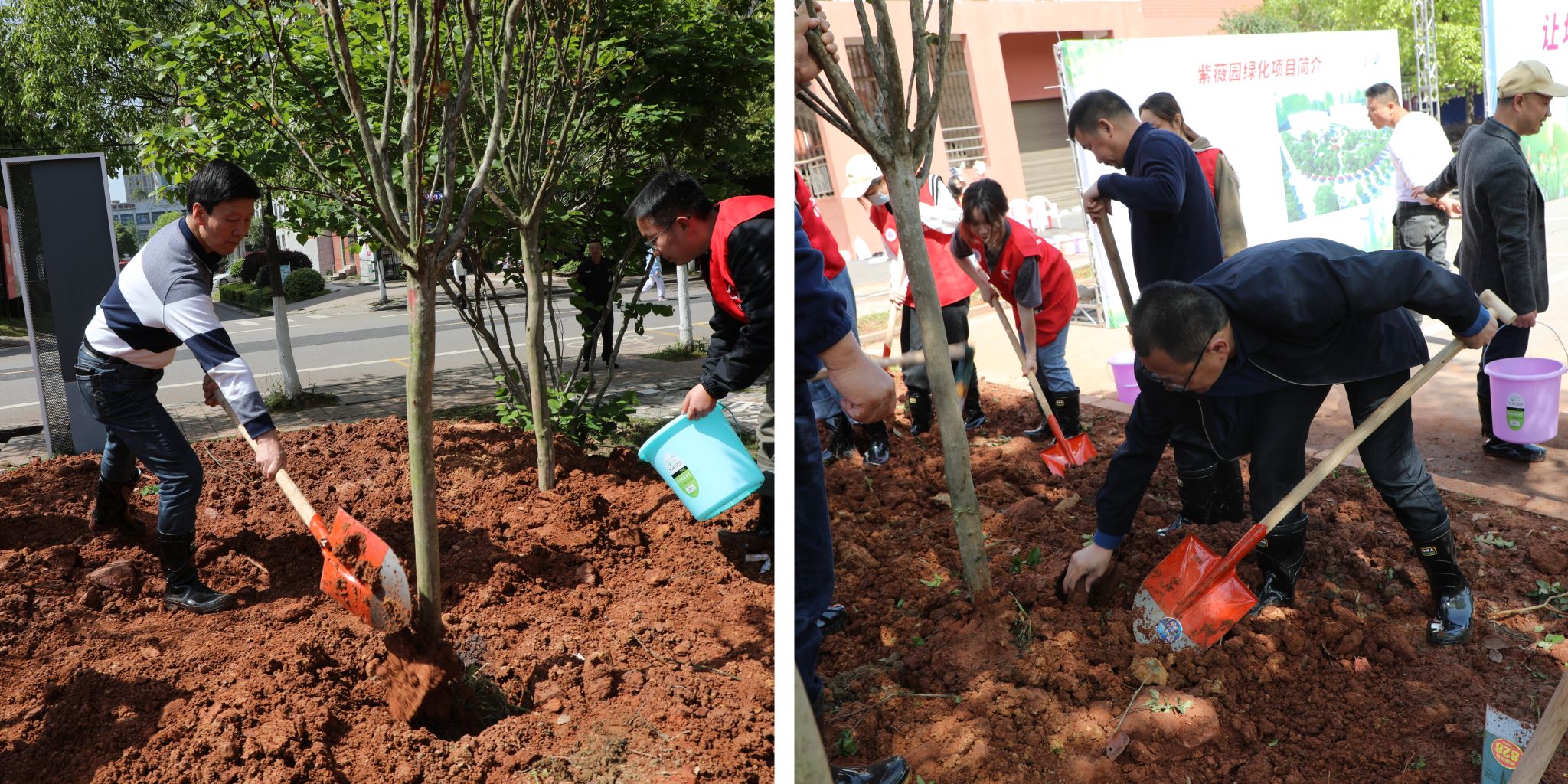 校领导与参加活动的师生志愿者依次签名留念。在紫薇园里,师生共同植树造林,铲土造坑、培土围堰、提水浇灌,活动现场气氛热烈。