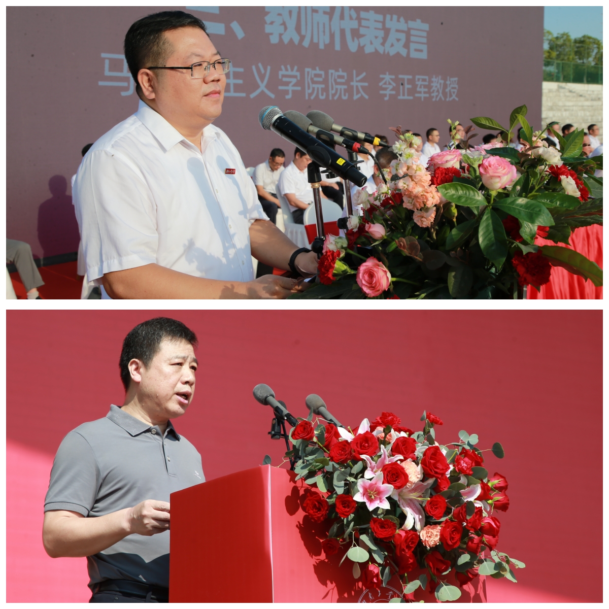 在河西校区,教师代表马克思主义学院李正军教授希望新生们读好“理论之书”“信仰之书”“实践之书”“修养之书”“勤勉之书”,肩负起当代青年大学生的使命与担当。土木工程学院武俊鹏学长结合自身求学经历,激励学弟学妹们立志做有理想、敢担当、能吃苦、肯奋斗的新时代好青年。何雨霖、郭奇雄、李文清作为新生代表发言,表示将以此为新起点,砥砺前行,在“明德、精业、求实、创新”的校风引领下为学校荣耀再添一份力。在河东校区,商学院陈支武教授、科技学院张琪分别作为教师、在校生代表发言,表达了对新同学的热烈欢迎和期待;新生代表林轩同学发言,承诺坚定不移听党话、跟党走,努力成长为“有理想、敢担当、能吃苦、肯奋斗”的新时代大学生。高家易、刘嘉玲带领全体新生进行了庄严宣誓。