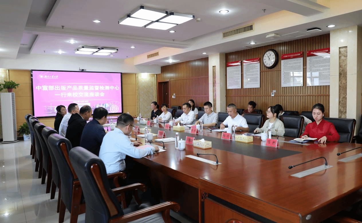 10月18日上午,中宣部出版产品质量监督检测中心副主任仇英义、印刷复制质量部主任王军科来校调研。副校长殷晓元出席,湖南出版集团党委委员、副总经理熊名辉,湖南省委宣传部出版产品质量监督检测中心,校期刊社、包装与材料工程学院等相关负责人参加座谈。