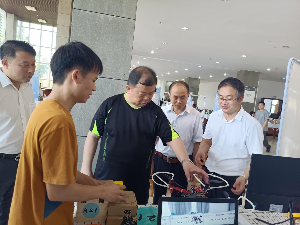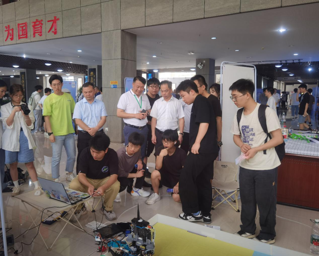本届电气科技节以“毕业设计优秀作品展”和“第九届控制类国家级教学团队合作联盟及其建设研讨会”为主线,以电类毕业生双选会和大三实习供需见面会、汇川校园日活动、校企面对面研讨会、20级自动化+包装工程《包装自动化》科普大赛等主题活动为亮点。“汇川杯”各项活动精彩纷呈,其中的电类毕业设计作品展给全校师生提供了科技盛宴,291名毕业生的86个作品在图书馆主会场和崇慧楼分会场现场展出,给予参与评审的企业导师、校内导师、线上线下观众沉浸式体验。经过严格评审,综合企业导师、校内导师和线上线下观众评分情况,此次86件作品,21件来源于企业的需求,最终11件企业作品获奖,获奖率为52.38%。本次作品展评出特等奖4组,包括A15组杨清霖团队的“板球运动控制系统设计”、AA22组王梅恒团队的“倾转双旋翼无人机”、B6组欧哲滔团队的“基于物联网的车间监控方案及实现”、A4组李旭峰团队的“基于FOC控制的平面五连杆机器人设计与实现”。此次针对企业选题设立特别奖,由深圳市汇川技术股份有限公司企业导师提供选题并全程指导的D6组郭立乾团队的“基于视觉定位的六关节机器人扣盖机”荣获此奖项。