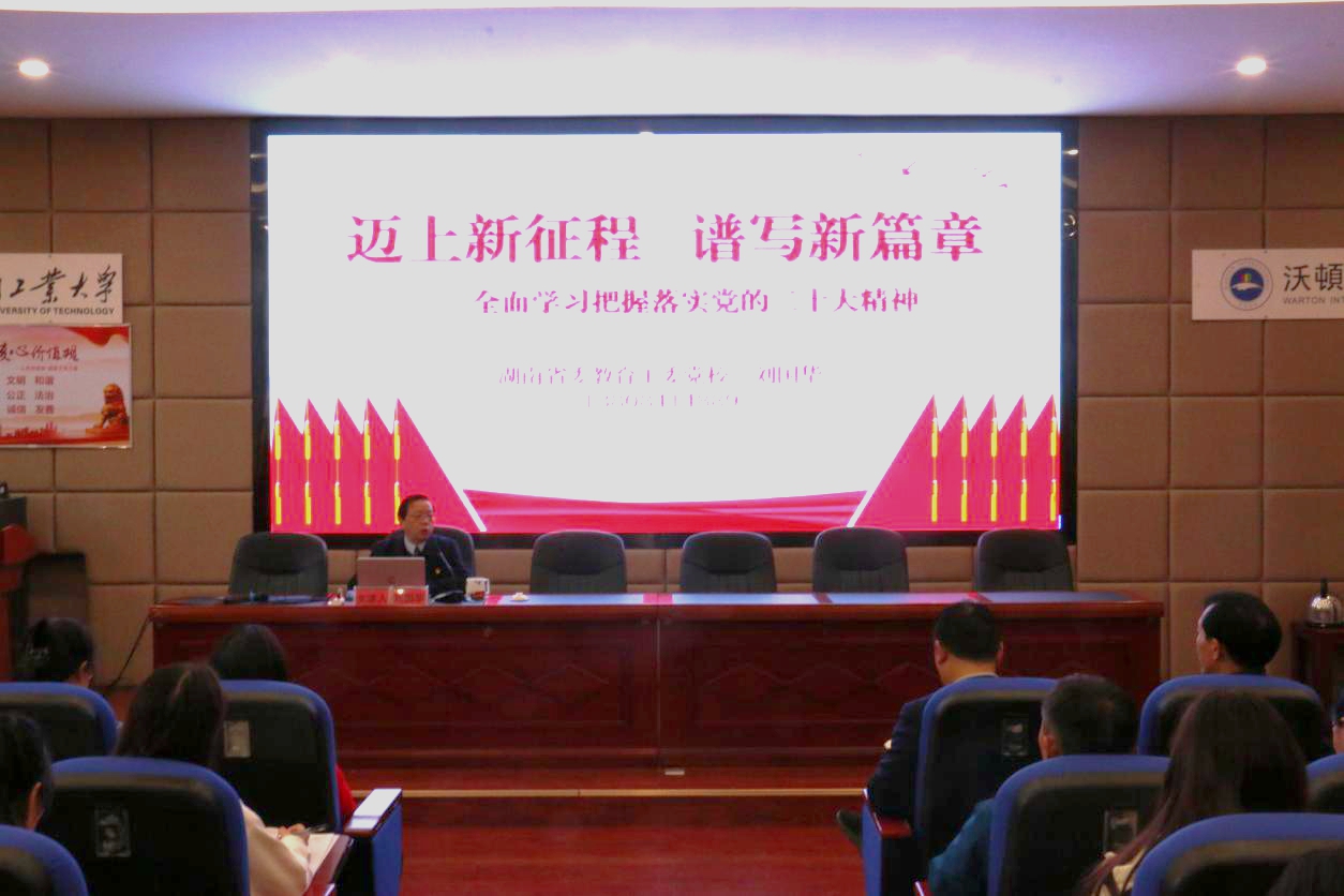 近日,德赢包装与材料工程学院特邀湖南省委教育工委党校常务副校长、省高校干部培训中心主任、书记刘国华教授来校作题为“迈上新征程,谱写新篇章——全面学习把握落实党的二十大精神”专题辅导报告。学院党委班子成员、师生代表参加学习。