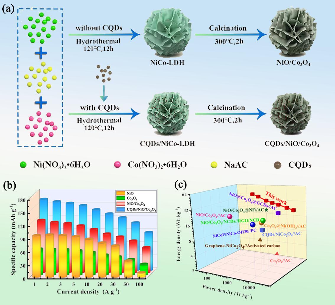 (b)(a)CQDs/NiO/Co3O4异质结花状微球的制备过程示意图,(b)NiO、Co3O4、NiO/Co3O4和CQDs/NiO/Co3O4电极的倍率性能图,(c)Ragone图