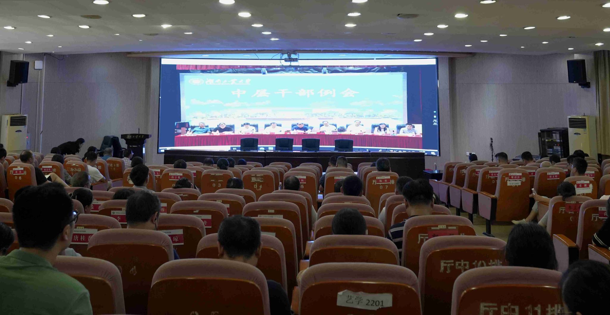 全校处级干部在崇乐楼音乐厅主会场参加会议,科级干部在崇美楼129报告厅分会场参加会议。