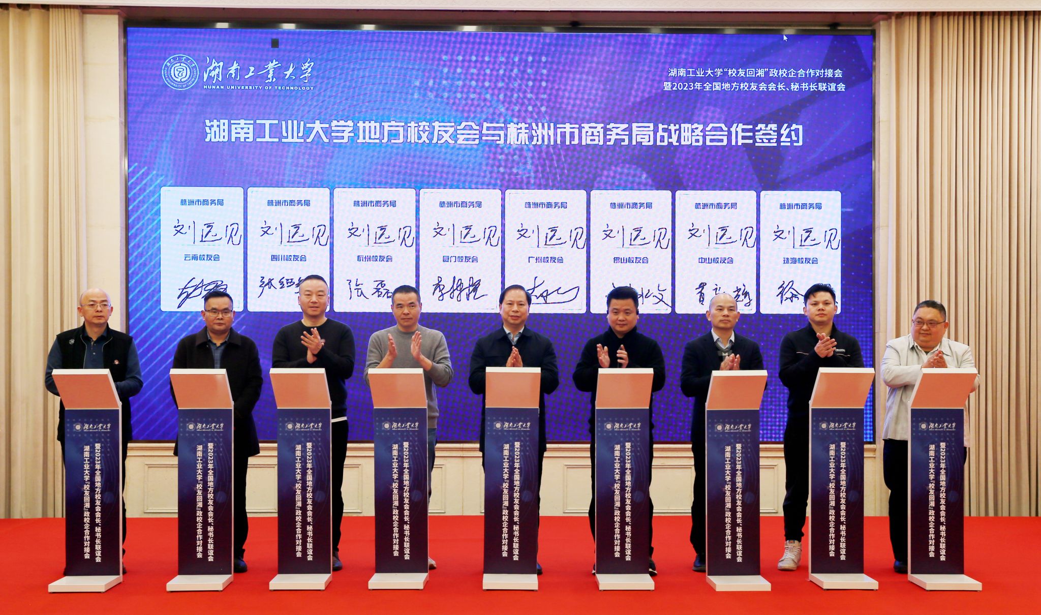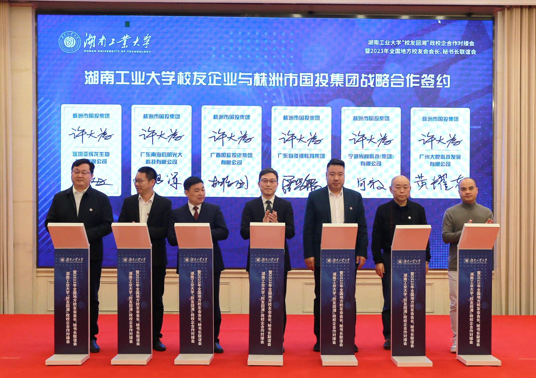 1月13日,株洲市、德赢AC米兰官网“校友回湘”政校企合作对接会在四川成都召开,德赢AC米兰官网校友总会与株洲市人民政府签订战略框架性协议,德赢AC米兰官网8个地方校友会与株洲市商务局签订招商引资框架协议,6家校友企业与株洲市国投集团签订战略合作协议,一批合作项目落户株洲。株洲市委副书记、市委政法委书记王卫安,市委常委、副市长刘亚亮,校长蒋昌波,校党委副书记王利华出席。副校长于惠钧主持会议。