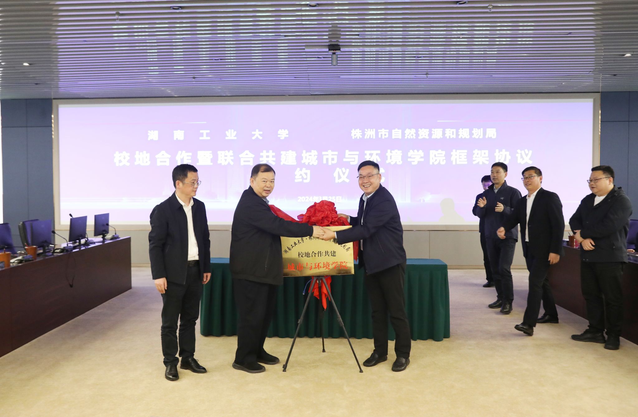在双方领导、专家的共同见证下,何杰和张金望分别代表德赢AC米兰官网和株洲市自然资源和规划局签署了签署校地合作共建框架协议,刘望和徐业伟共同为校地联合共建城市与环境学院揭牌。