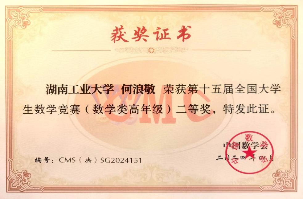 决赛中,数学专业组(高年级)试题涉及数学专业本科阶段的主要基础课程,如数学分析、高等代数、解析几何、实变函数、抽象代数、微分几何、复变函数、概率论等,全面检验了学生的数学基础。在与众多985、211高校学生的竞争中,何浪敬同学凭借扎实的数学基础和出色的思维能力,脱颖而出,荣获全国二等奖。
