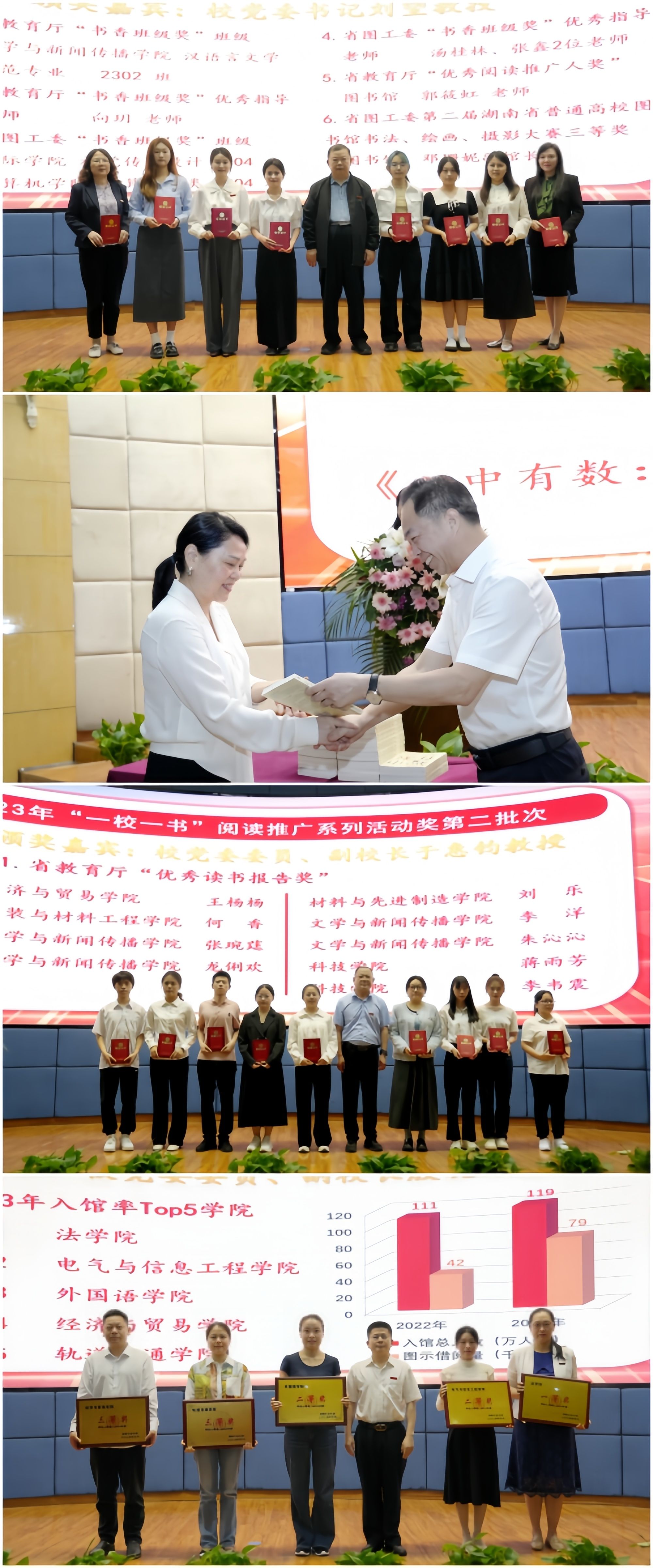 仪式上,校领导为2023年度省教育厅“书香班级”“优秀阅读推广人”“优秀读书报告奖”“阅读之星”等获奖单位和个人进行颁奖。向玥、龙俐欢分别代表优秀指导老师、优秀读书报告获奖者发言。学院师生代表接受了组委会赠送的本年度阅读推广精读图书《心中有数:生活中的数学思维》。