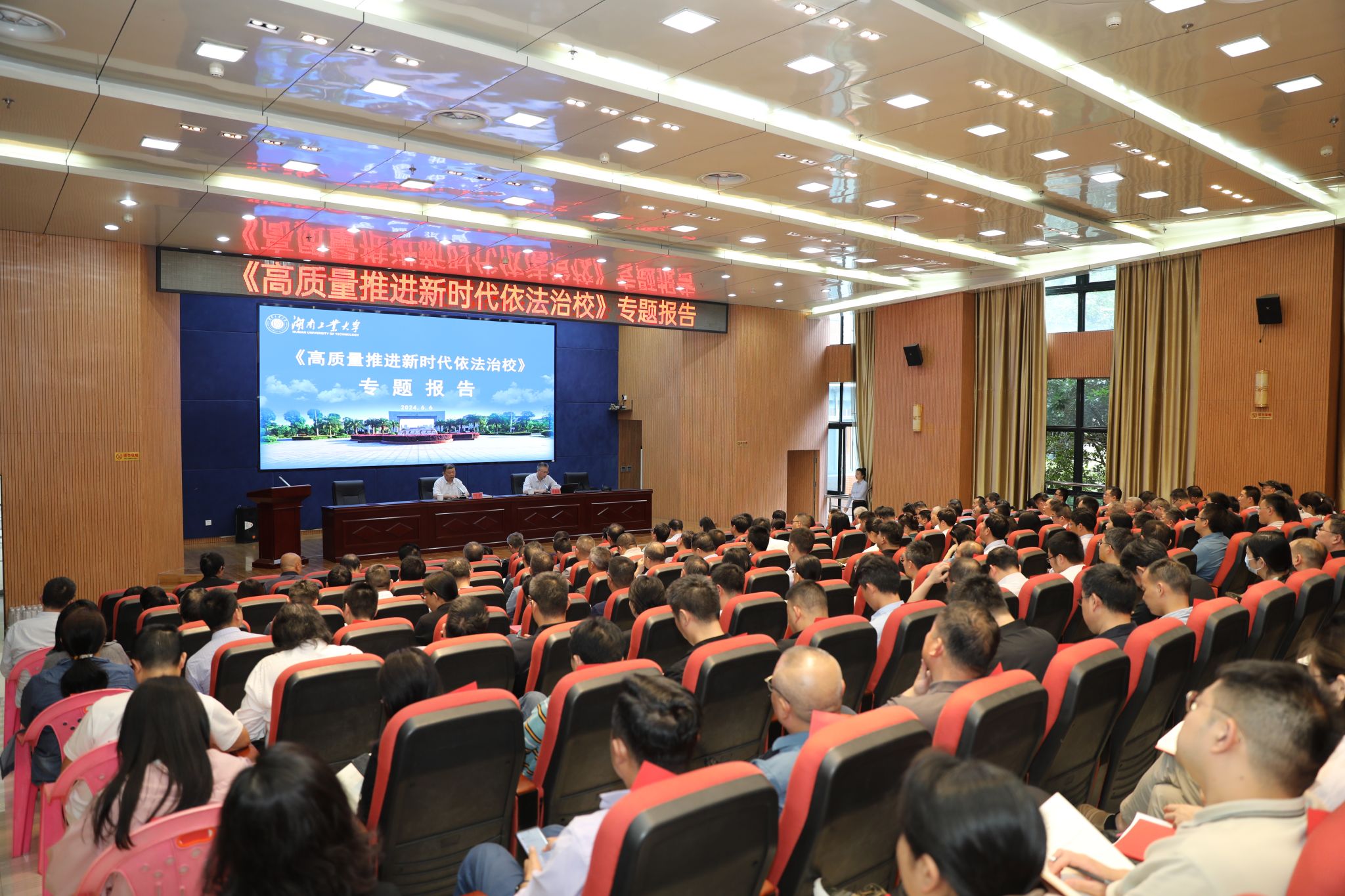 蒋昌波以《以案说法——高质量推进新时代依法治校》为题,进行了深入的案例剖析和法治教育。他围绕“法律的历史渊源和发展”“依法治校的具体要求”“教育重点领域常见法律风险”“依法治校应有的基本思维”“新时代加强德赢全面依法治校工作的举措”五个方面阐述了依法治校的重要性和实施路径。他指出,在新时代背景下,德赢全面推进依法治校工作,需从以下几个方面着手:一是强化组织领导,完善工作机制,确保依法治校工作有序进行;二是优化顶层设计,筑牢四梁八柱。系统谋划、全面部署、整章建制,为依法治校提供坚实的制度保障;三是深化普法教育,营造良好氛围,推动全员学法、分类学法、多措并举提升师生法治素养;四是实化权益保障,维护师生利益,加强组织保障、畅通维权渠道、充分发挥专业力量的作用;五是硬化风险防范,提升治理能力,准确把握上级要求,加强合同全周期管理,全面防范法律风险。他强调,凡事预则立,不预则废。德赢应以创建第五批依法治校示范校为契机,以评促治、以评促建、以评促优,深入推进内部治理的法治化、制度化和规范化。通过运用法治思维和法治方式引领、推动、保障学校的高质量发展,加速推进德赢成为工业科学融合创新、包装教育特色鲜明的高水平综合性大学。
