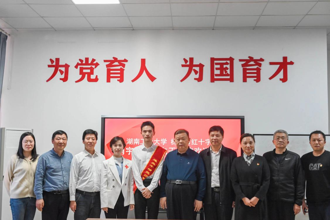 10月23日下午,包装与材料工程学院举行肖宇同学捐献造血干细胞欢送仪式,党委书记刘望,副校长范晓阳,株洲市红十字会党组成员、秘书长刘静,以及包装与材料工程学院领导班子出席。