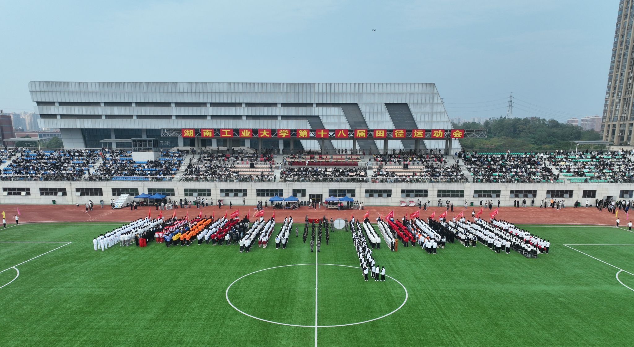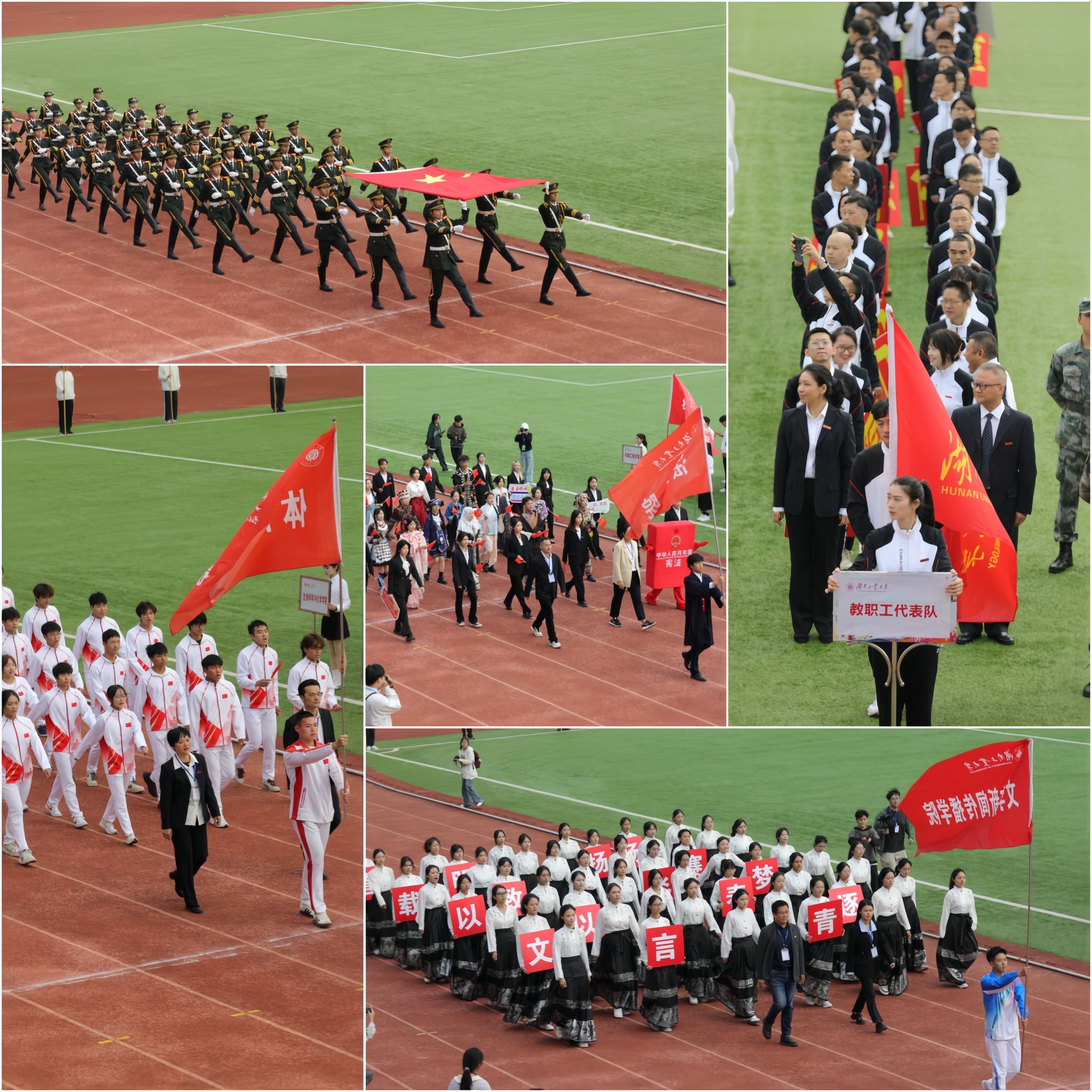 开幕式伊始,国旗护卫队、校旗护卫队、彩旗方阵队、裁判员方阵队、教职工代表方阵队、各学院方阵队迈着矫健的步伐依次进场。身着整齐服装的各方阵队精神昂扬地前行,当行进至主席台前时,各方阵队或摆出富有寓意的造型,或喊出嘹亮的口号,为开幕式增添了热烈而喜庆的气氛。