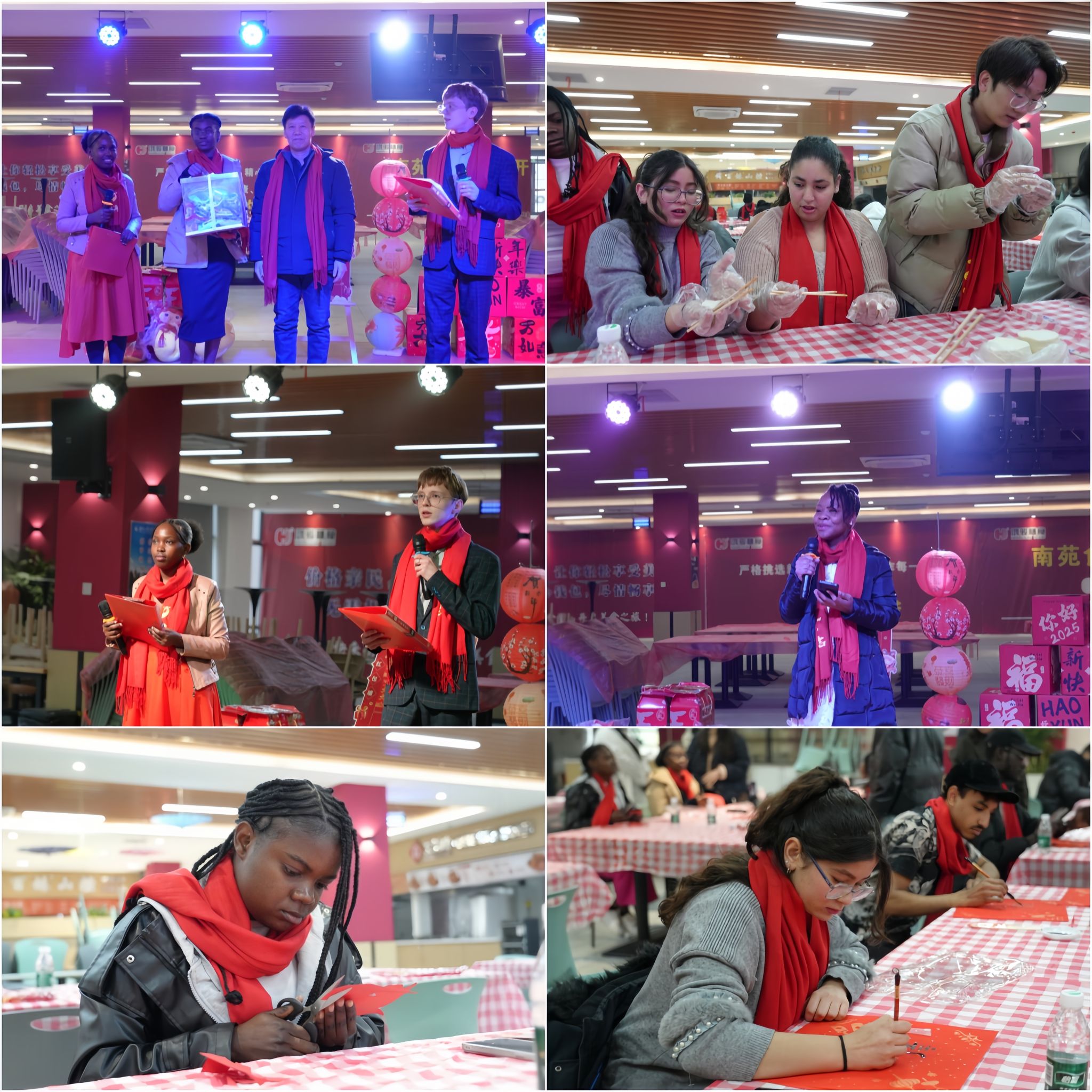 本次活动由国际学生Rebecca(乌干达)和Nick(俄罗斯)担任主持。来自马里的Sephora同学以一曲《My heart will go on》开启了活动序幕。现场设置了中国传统文化知识抢答、书写福字、剪纸窗花、包制饺子、幸运抽奖等环节,国际学生们在互动中学习传统习俗,体验中国年的独特风情,全方位感受“中国年”的乐趣与传统智慧。