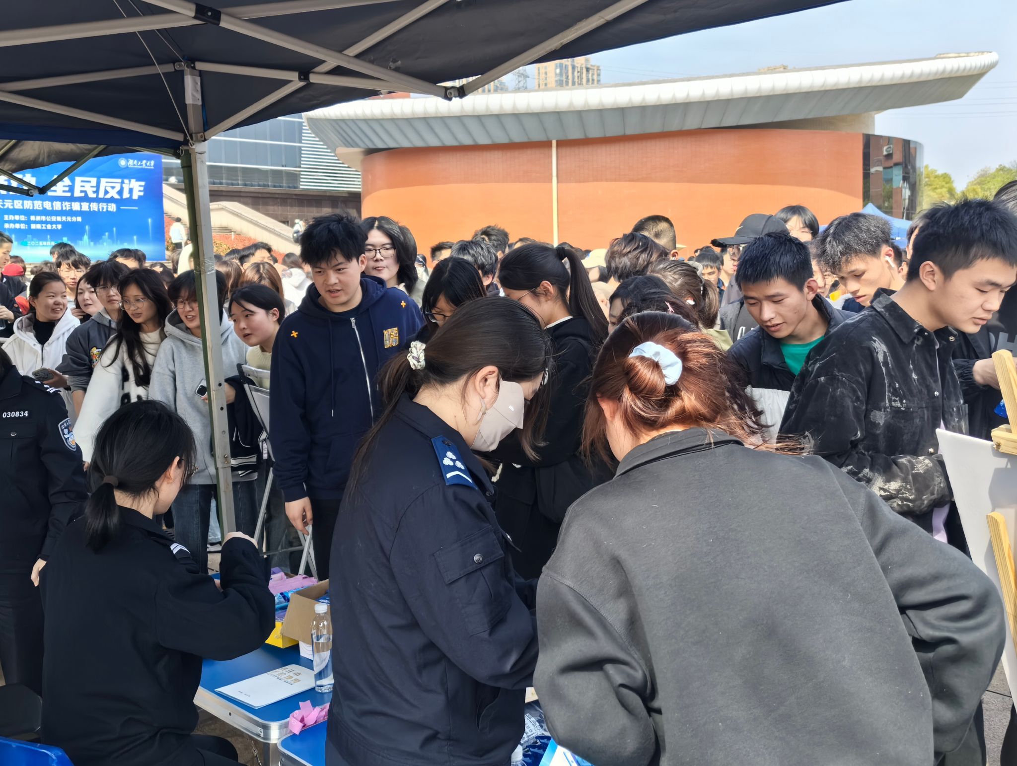 随后,全体学生代表进行了反诈宣誓,于惠钧向“反诈宣讲团”授旗并宣布活动开始。活动现场,天元公安分局的民警们通过悬挂横幅、摆放展板、发放宣传资料、现场讲解等方式,向师生们详细介绍了电信网络诈骗的常见手段、防范措施以及遭遇诈骗后的应对方法。师生们纷纷表示,通过参加此次活动,他们对电信网络诈骗有了更加深入的了解,也掌握了一些实用的防范技巧,今后将更加注重个人信息安全,提高警惕,避免上当受骗。