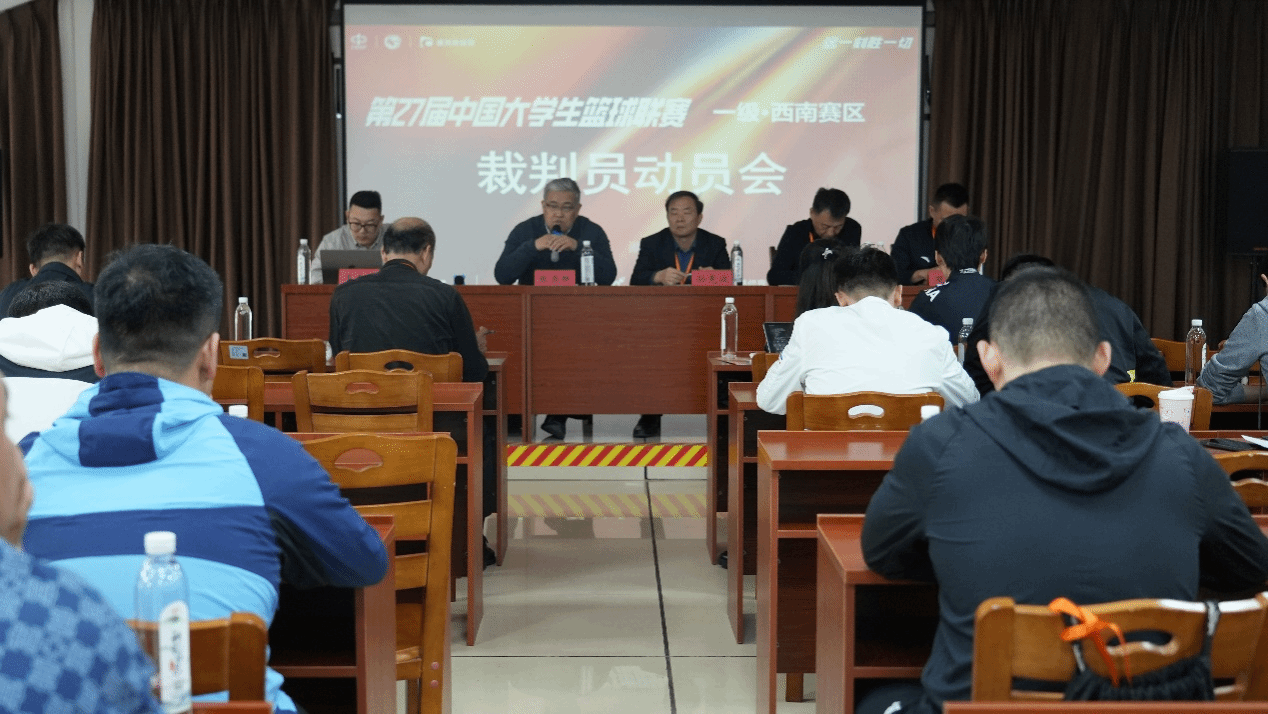 第27届中国大学生篮球一级联赛(西南赛区)将于4月8日至4月16日在株洲举行。开赛在即,为保证赛事顺利进行,4月7日,裁判员动员会在株洲市体育中心召开,本次赛事所有裁判员参加会议。