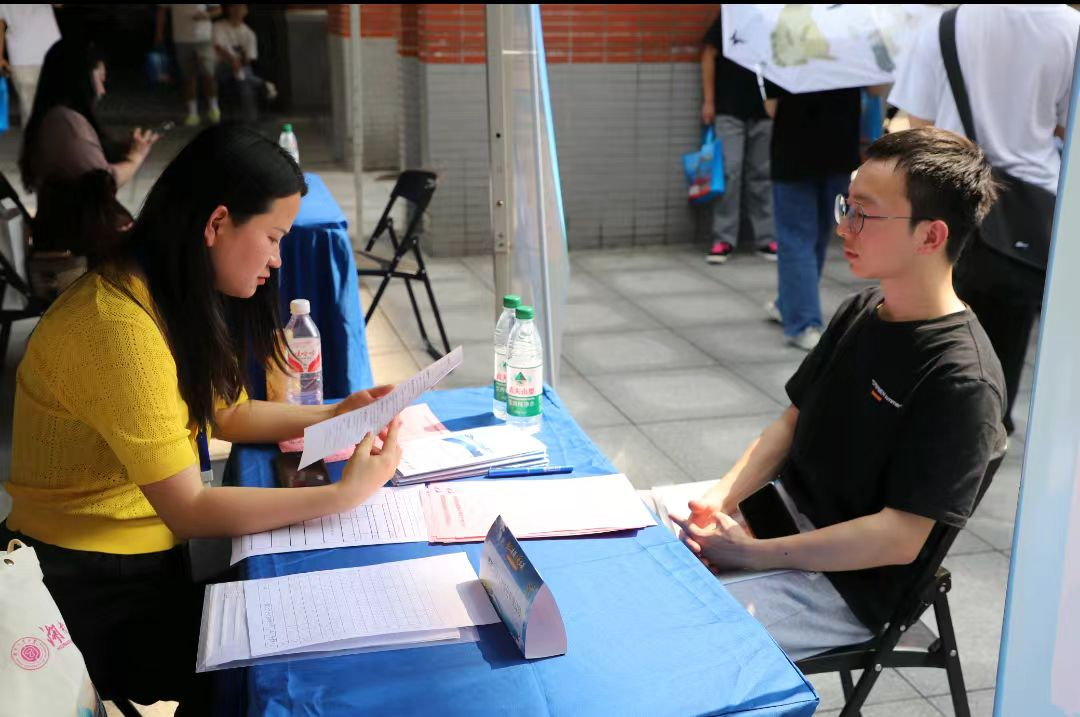 推介会后,双方共同前往崇学楼西门前坪,参加“智汇潇湘,才聚五溪”怀化市2025年专场双选会。30余家重点企业提供500余个就业岗位,涵盖智能制造、生物医药、文旅开发等热门领域。招聘活动现场,毕业生积极与企业招聘负责人深入沟通,详细询问岗位要求、工作内容、薪资待遇、职业发展前景等信息;企业代表热情解答,并通过现场宣讲、发放宣传册、展示企业宣传视频等方式,全方位展示企业优势,部分求职者现场达成就业意向。