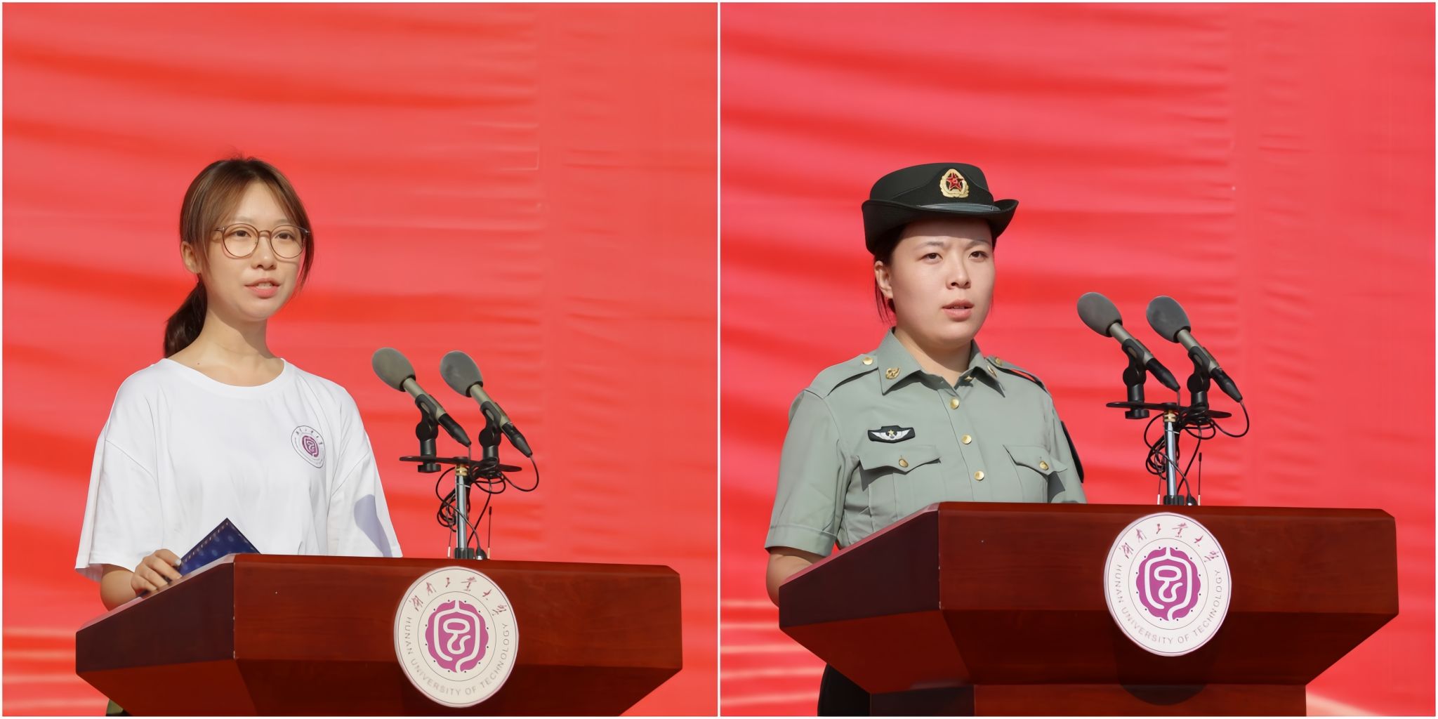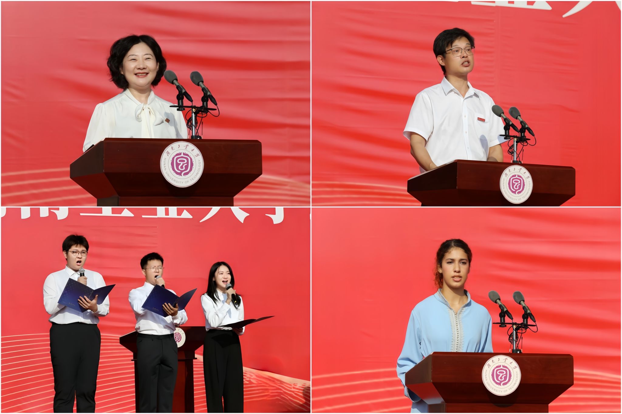教师代表蔡琨以“读万卷书,问万个为什么”鼓励新生勇于探索;九三阅兵观礼嘉宾、全国劳模刘宇辉校友分享成长经历,激励学子立志报国;新生代表刘雪倩、周志鹏、刘嘉乐联合发言,表达刻苦求学的决心;摩洛哥留学生阿雅表示要成为中摩文化交流的使者。