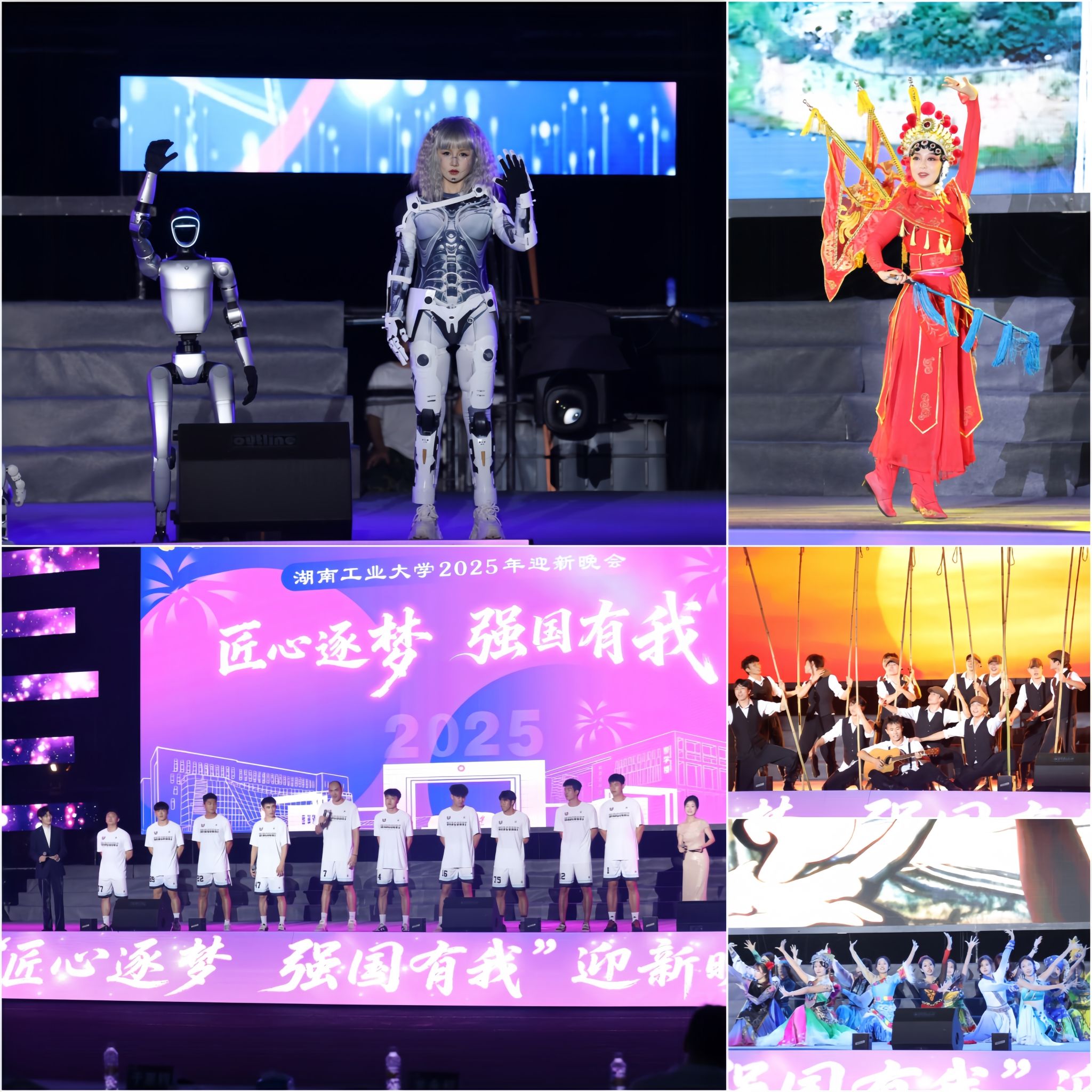 迎新晚会以“匠心逐梦 强国有我”为主题,分为“初见·旗帜之下”“绽放·五彩青春”“展望·强国有我”三个篇章,涵盖歌舞、民乐合奏、机器人秀、沙画、戏曲说唱等多种表演形式。晚会以齐舞《鸿.途》震撼开场,舞者们的矫健身姿与磅礴气势瞬间点燃全场。活力四射的原创歌舞秀《HUT欢迎你》,以青春欢快的旋律和朝气蓬勃的表演,向新生们传递了最真挚的欢迎。青音合唱团的红歌联唱大气磅礴,演唱者们同台接力、激情演绎,爱国情怀在青春的声浪中引发全场共鸣。材料科学与工程学院博士天团的老师们倾情献上表演唱《我们一起向未来》,展现了科研工作者多才多艺、亲切可爱的另一面。随后,晚会的第一个惊喜环节如期而至,作为各自领域杰出代表受邀现场观礼九三阅兵的校友们通过视频送来深情祝福与殷切期望,激励新生不负时代,勇担重任。