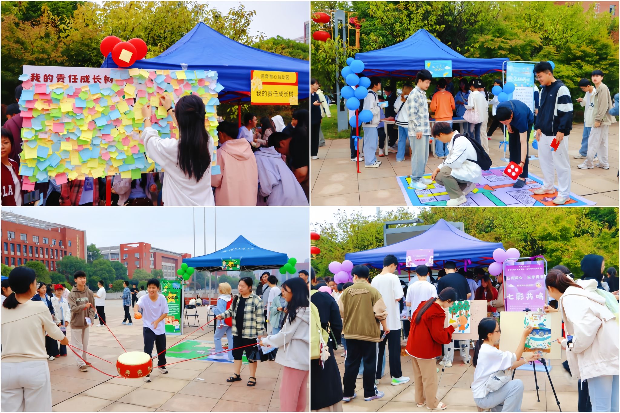 本次游园会创新融合德、智、体、美、劳“五育”与心理健康教育,设置七大主题区域、十项互动游戏,将心理成长融入趣味体验。学生在“德育育心区”通过“榜样的力量”感悟身边人的闪光品质,在“责任成长树”上书写青春担当;在“智育慧心区”参与“不被定义的自己”互动,勇敢撕下刻板标签,在“心灵棋遇记”中促进自我觉察;在“体育强心区”通过“不倒森林”“同心击鼓”等团队协作项目,在运动中释放压力、增进默契;在“美育润心区”体验“七彩共鸣”填色创作和“指尖韵律”手势舞,用艺术表达情感;在“劳育健心区”通过“心灵整理驿站”和“植得守护”等实践,在劳动中收获成就感。