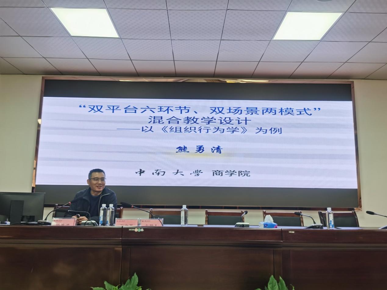 近日,商学院特邀中南大学商学院熊勇清教授为学院教师作《双平台六环节、双场景两模式混合式教学设计——组织行为学课程教学为例》的专题分享,对青年教师进行指导交流。学院相关负责人、教师代表聆听讲座。