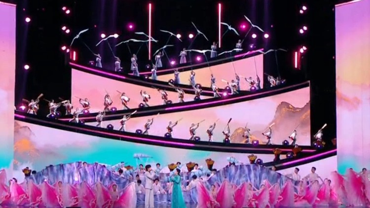 舞台之上,《天下岳阳楼》以力与美的交织重构历史场景:学生们以刚健舞姿模拟砌砖运木的劳动号子,当虚拟岳阳楼在光影中拔节生长时,千年文脉与青春力量完成跨时空对话;《在水一方》则以斑竹为意象,用轻盈舞步编织君山岛的浪漫传说,歌声与水袖共舞间,湖湘文化的婉约特质触达人心;《大美江湖》中,活力四射的群舞如江河奔涌,将湖南“三湘四水”的壮阔气象化作流动的视觉诗篇。