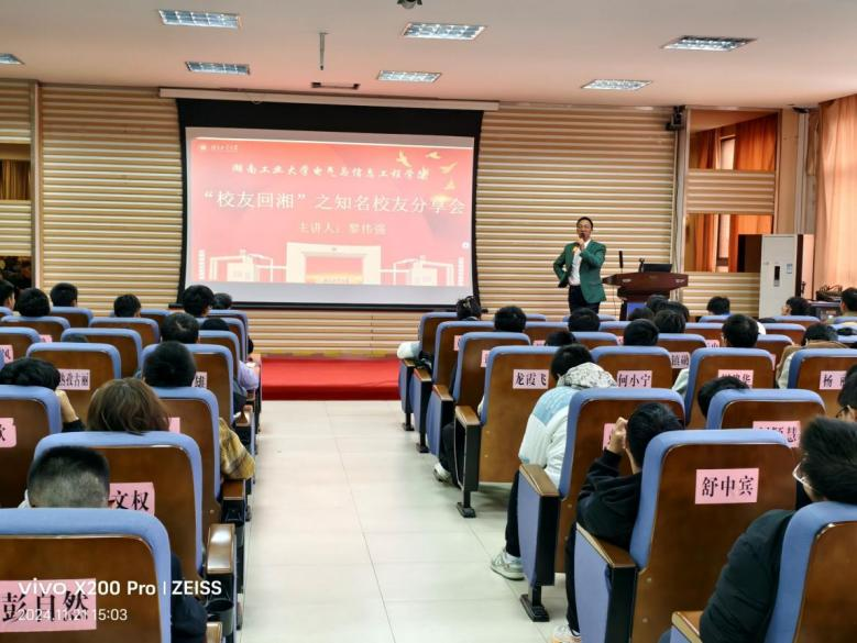 近日,由电气与信息工程学院校友会组织的2024“校友回湘”校友分享会在崇慧楼317报告厅举行,分享会邀请了优秀校友、广东穗名光电科技有限公司董事长黎伟强作分享,活动吸引了电气工程及其自动化专业的2024级全体同学的积极参与。