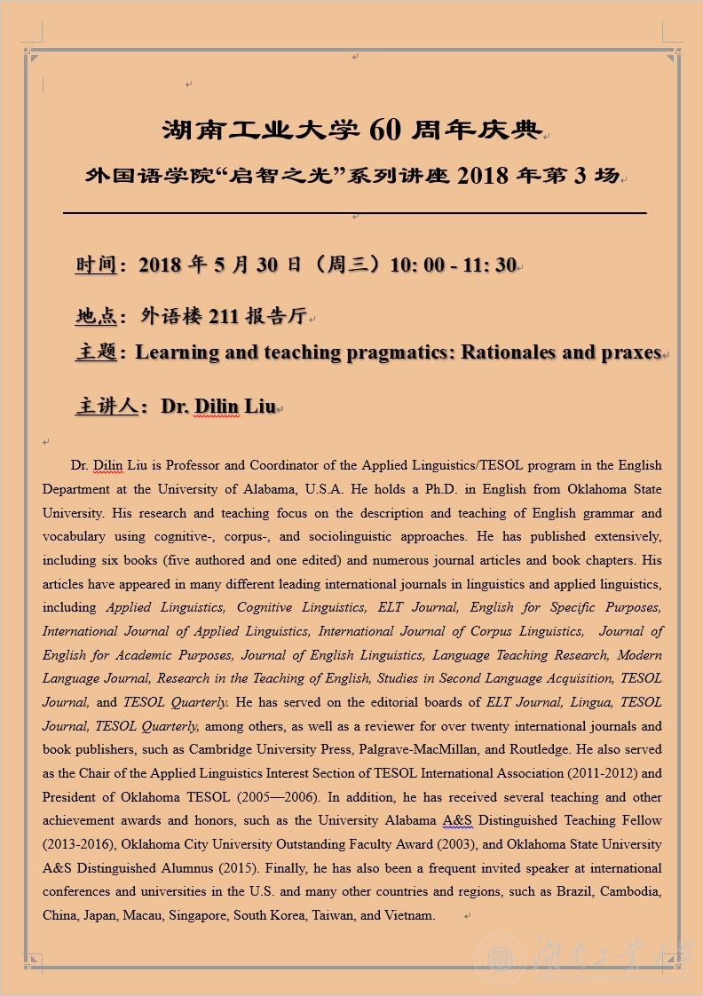 【德赢AC米兰官网办学六十周年庆典学术讲座---《Learning and teaching pragmatics: Rationales and praxes》】